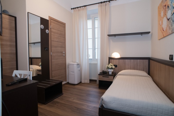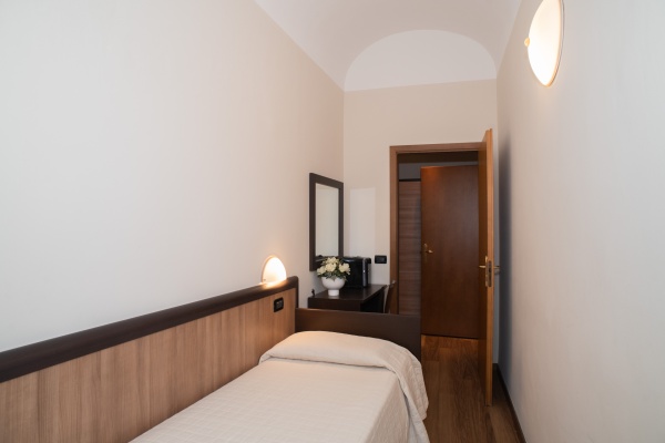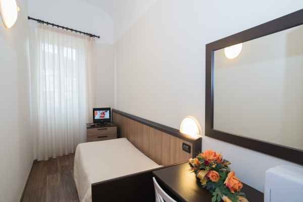 Confortevoli e tranquille camere singole dotate di bagno privato, phon, cassaforte, telefono diretto, TV Sat LCD, climatizzatore mobile.