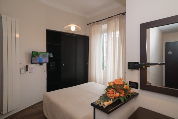 Confortevole camera con letto matrimoniale o due letti separati, dotata di bagno privato con doccia, phon, cassaforte, telefono diretto, TV Sat LCD, climatizzatore mobile.
