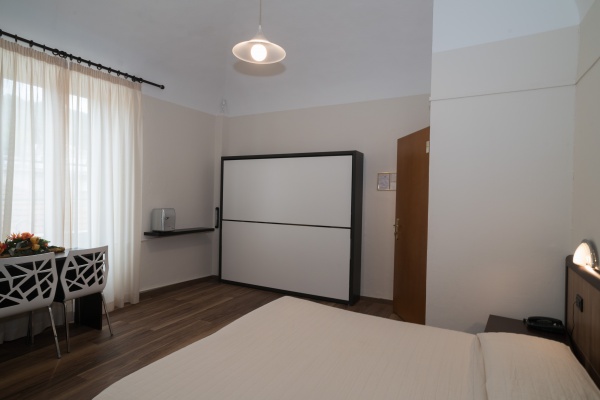 Camera di ampia metratura composta camera quadrupla con letto matrimoniale o due letti singoli, terzo e quarto letto a castello a scomparsa più camera singola comunicante per un totale di 5 posti letto.