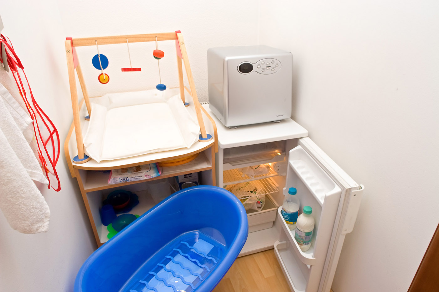 Situata al 1°-2° e 3° piano, è attrezzata con fasciatoio, scalda biberon, mangiapannolini, vaschetta per bagnetto, frigorifero, forno a microonde, sterilizzatore a vapore, riduttori wc e vasini. Inoltre (novità) asse e ferro da stiro.